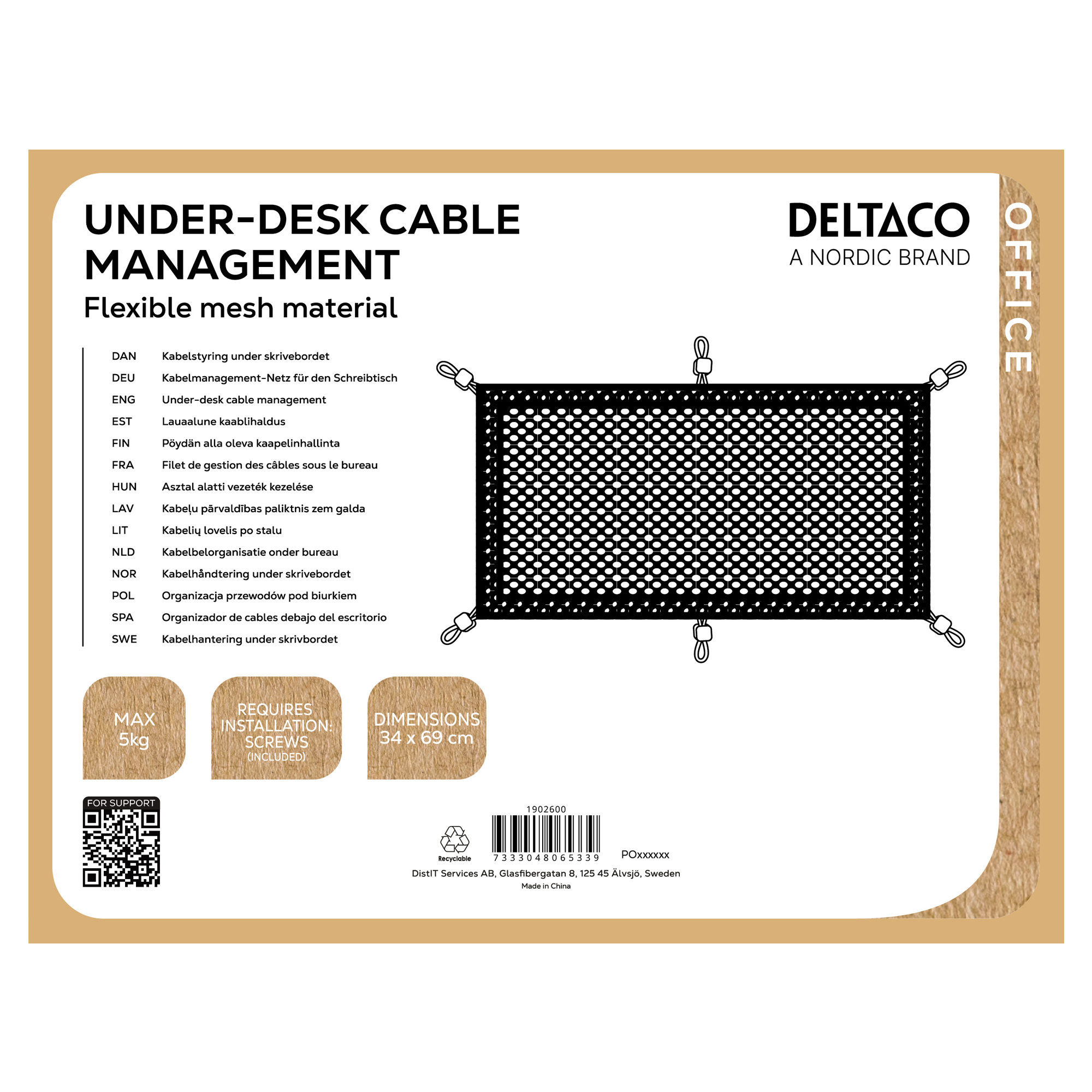 Förpackningen innehåller: kabelhanteringsnät, 6x skruvar, 6x skruvinsatser, 1x borr och 1x buntband