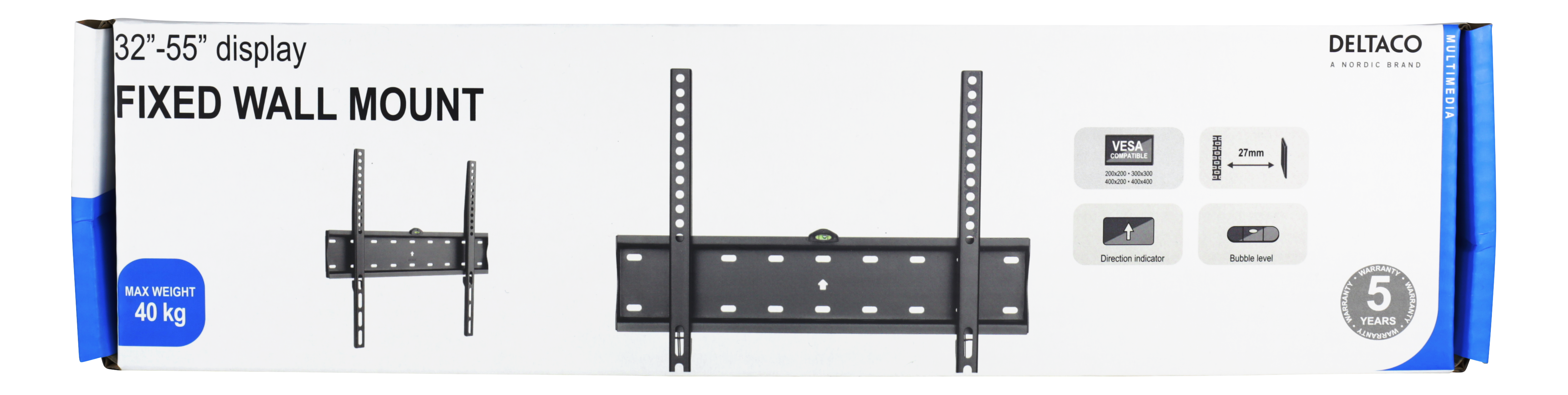 Väggfäste för skärmar upp till 55" och 40kg i vikt. Väggfästet har en direktionsindikator för att visa vilken sida som ska peka uppåt, den har ett inbyggt vattenpass för att underlätta rak montering. Väggfästet bygger ut 27mm från väggen.