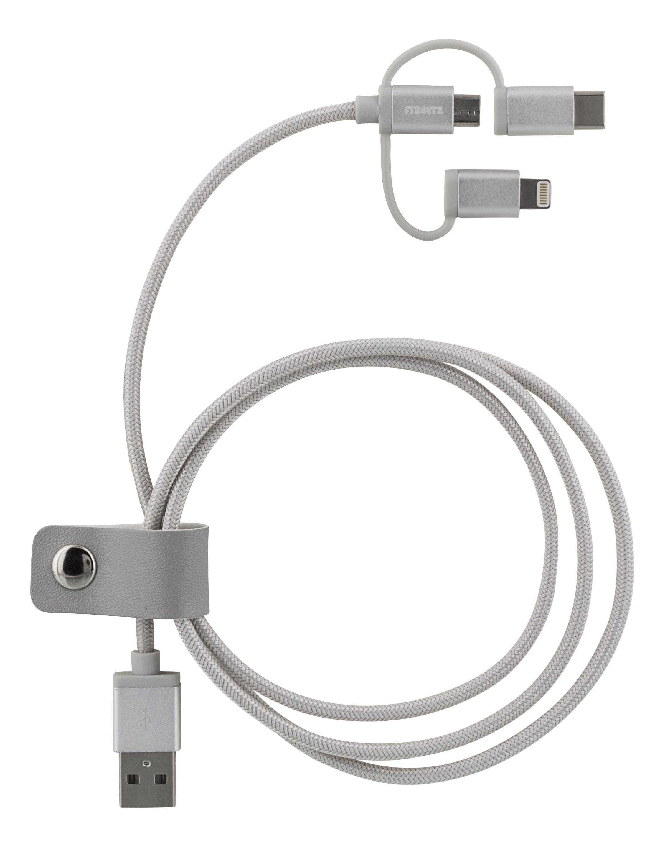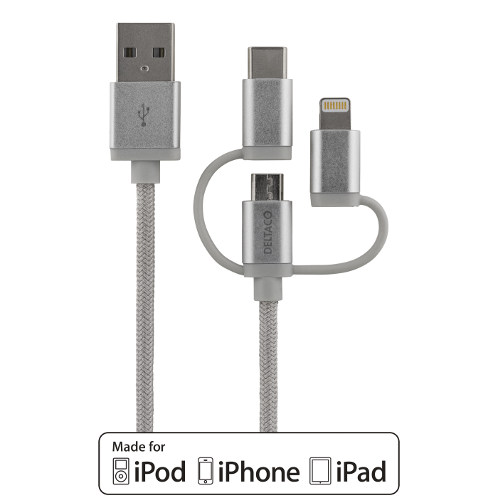 3-i-1 USB synk-/laddningskabel, universell, USB-2.0, 2,4A/12W, MFi, 1 m, silver