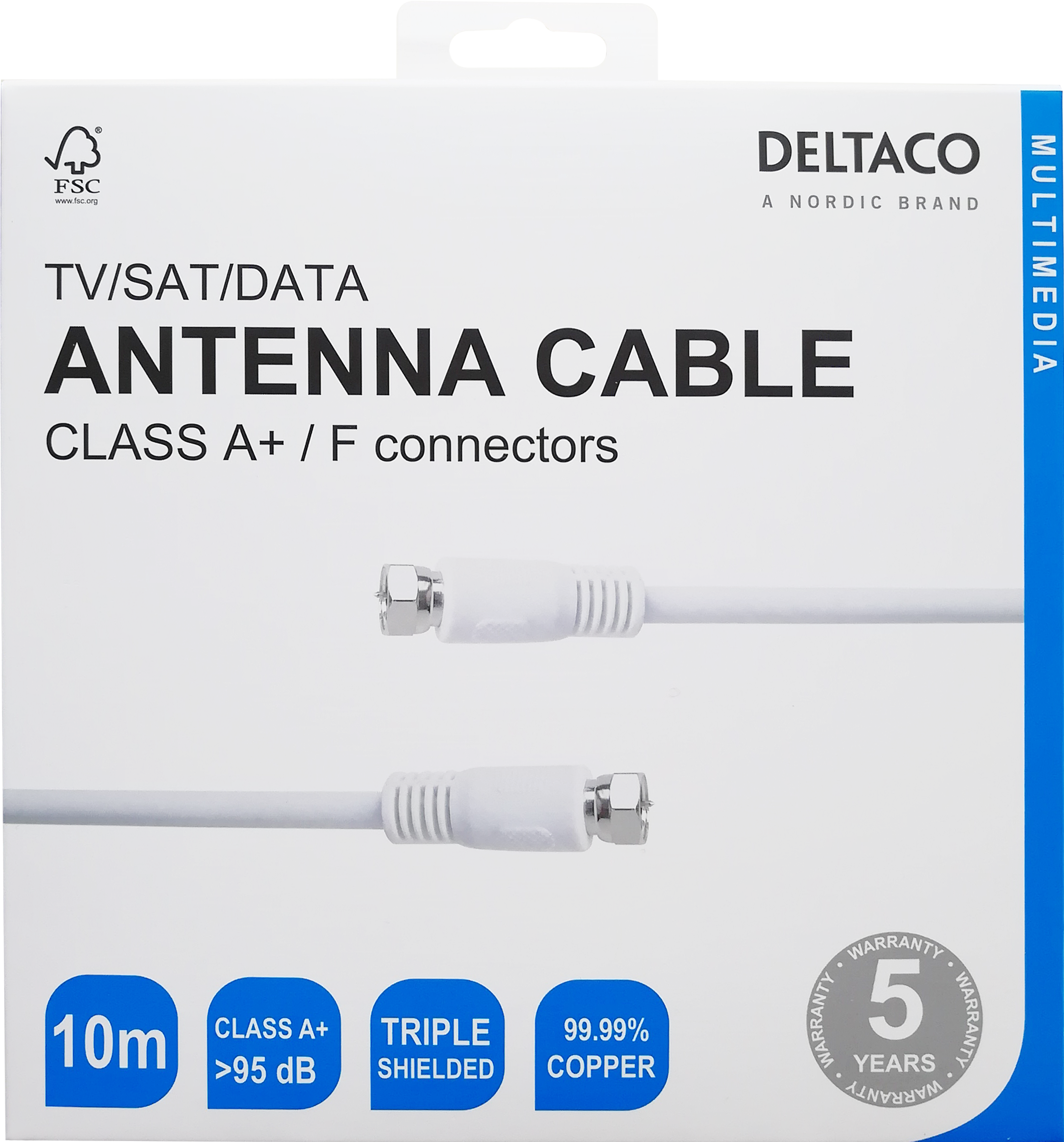 Antennkabel för TV/SAT/DATA med klass A+/F-kontakt. Klass A-certifieringen säkerställer att antennkabeln ger en stabil och pålitlig anslutning för din TV och andra enheter. Läs mer...