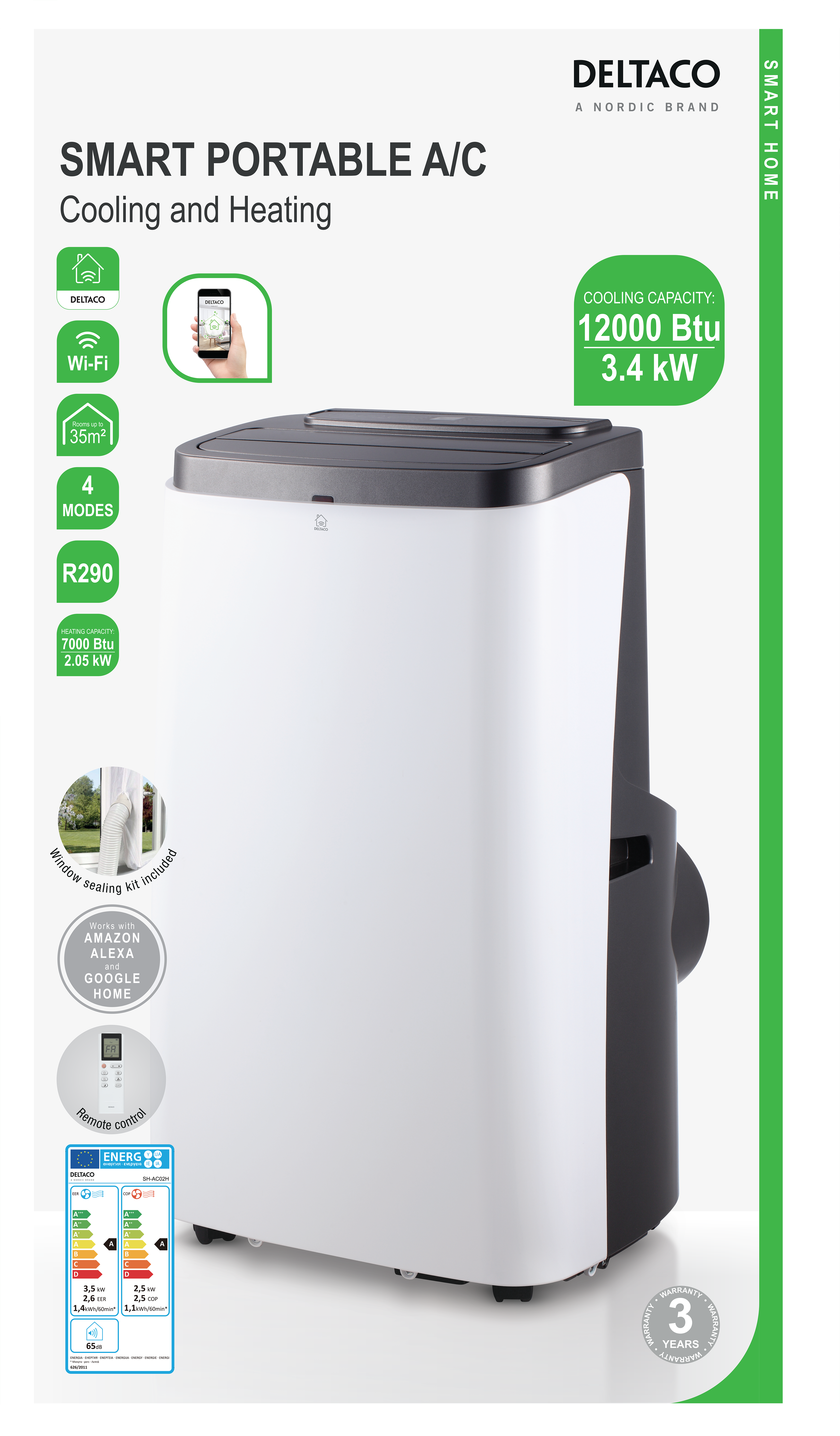 Du kan styra AC:n direkt på kontrollpanelen eller med fjärrkontrollen. Du kan också styra den med DELTACO Smart Home appen som installeras enkelt i din smartphone. Har du dessutom röstassistent hemma, Amazon Alexa eller Google Home, styr du enkelt upp önskat inomhusklimat genom att använda din röst – smart, inte sant?